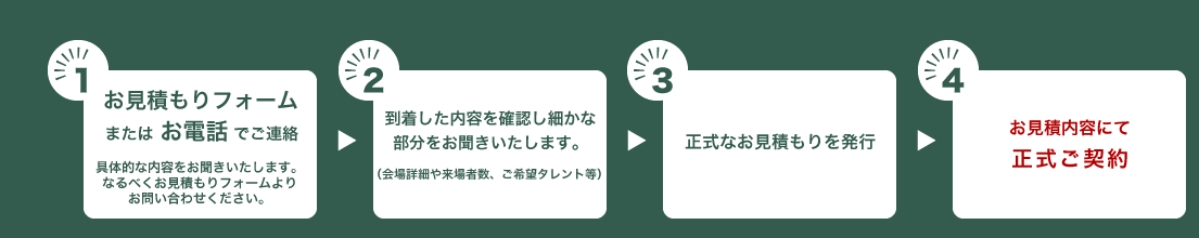 ※①~③までは無料にて承ります。④の正式ご契約により出演者のスケジュールを押さえますので以降のキャンセルについてはキャンセル料が